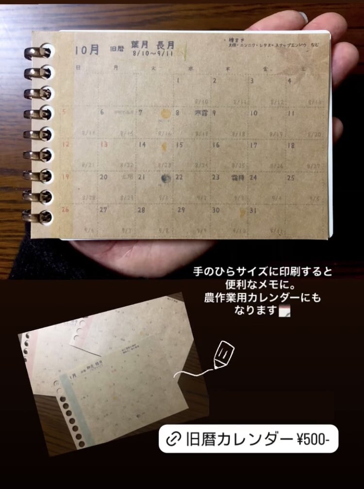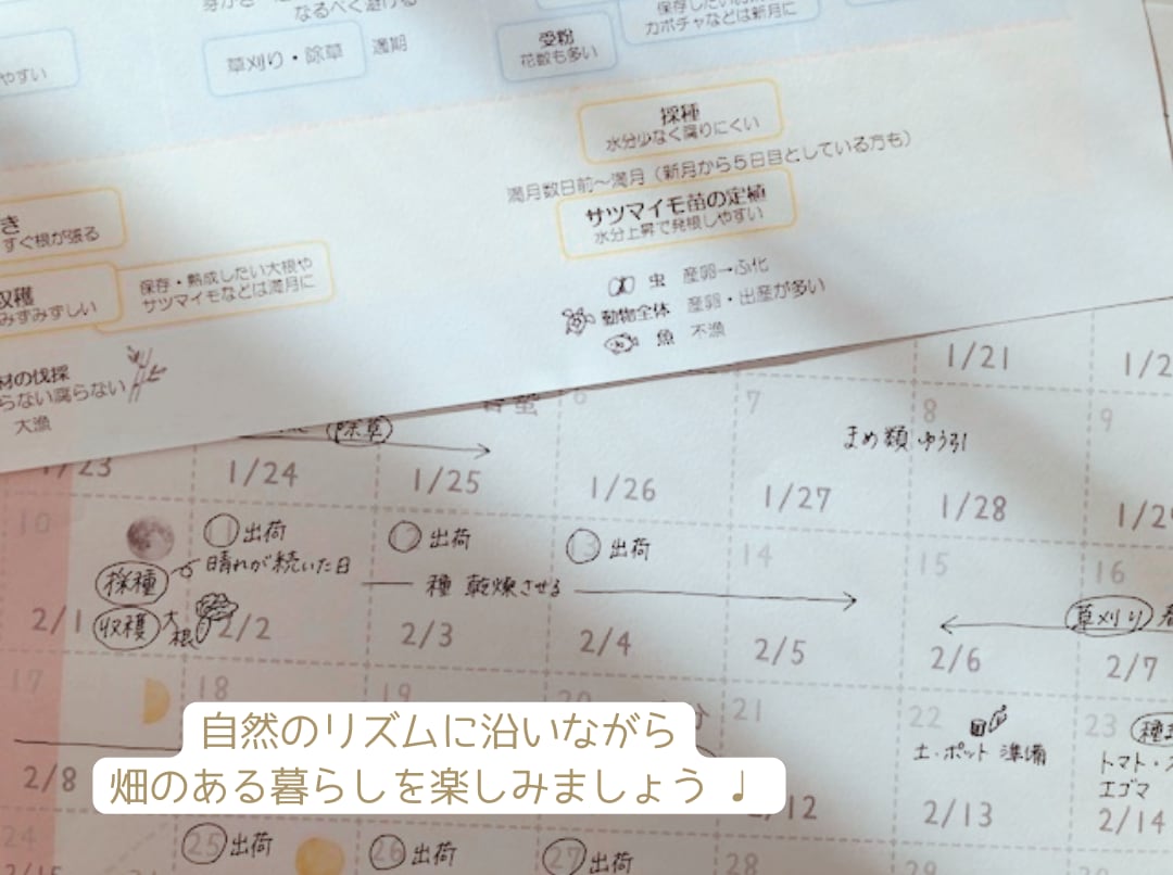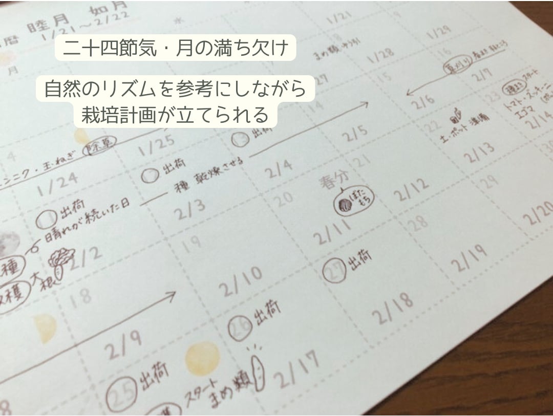 このカレンダーには月ごとに満月や新月を示しており、それに合わせて農作業の計画を立てることができます。植物のリズムに合わせて人が手を加えることで、植物の力を最大限に引き出します。