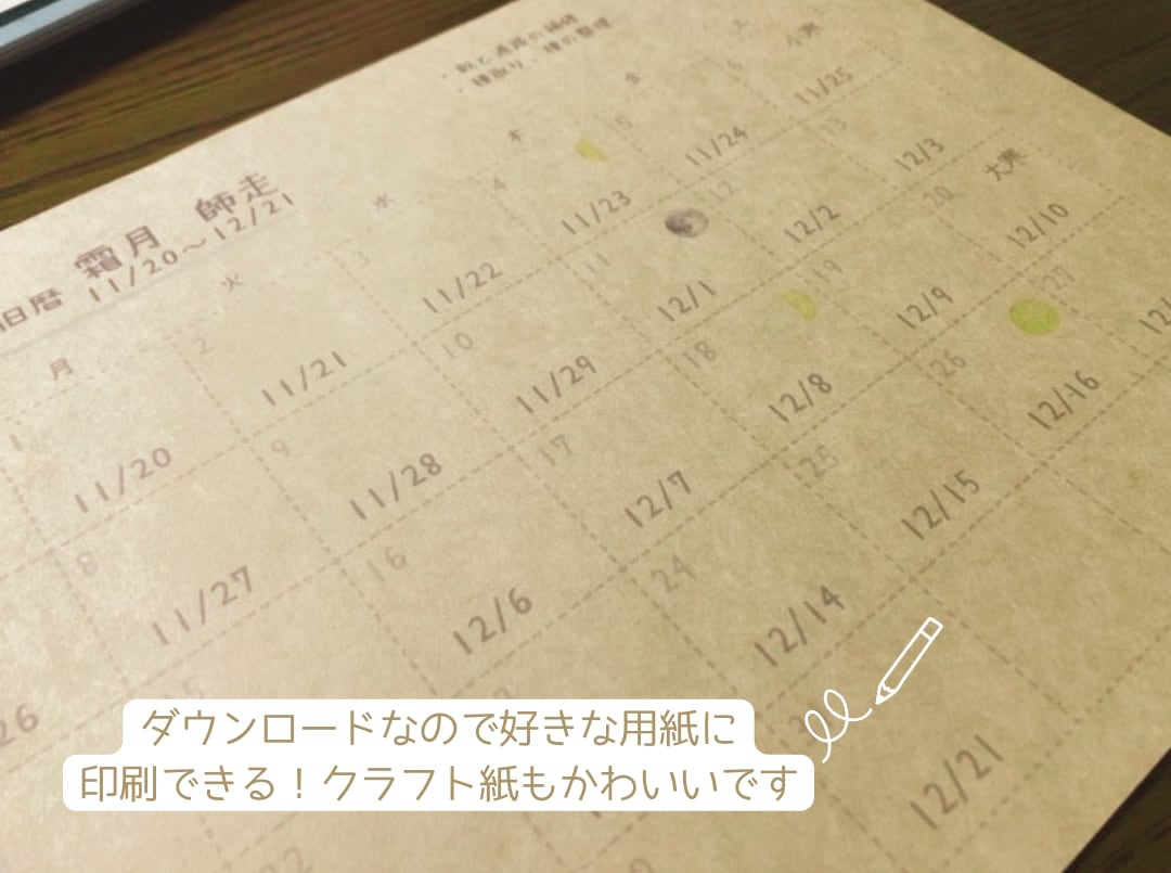 また、太陽のエネルギーが上昇しはじめる冬至を1年のはじまりとする考え方もあります。冬至・夏至などを含む24節気も入れているので、太陽と季節の移ろいを感じながら1年を過ごしてみてください。